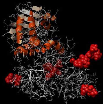 Abb.: 3D-Raumstruktur von Ricin, PDB-ID 2AAI, visualisiert mit Chimera. Andere Seitenansicht, unten Erkennungsregion, oben eigentliches Gift, rote Bereiche sind die Zuckerketten.