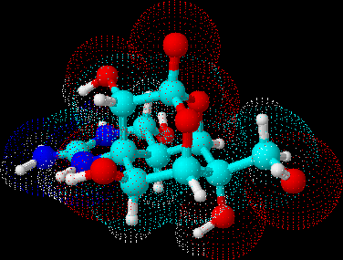 Abb.: Kalottenmodell des Tetrodotoxins. Links im Bild die