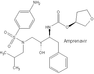 Protease-Hemmer, kompetitive Hemmung durch Bindung am aktiven Zentrum, verhindert die Prozessierung viraler Polyprotein-Vorstufen. Es werden unreife, nicht infektiöse Virus-Partikel gebildet. Amprenavir ist einer der älteren Protease-Hemmer (Markteinführung 2001), der alleine heute kaum noch in der Therapie akzeptabel ist, weil dann 2x tgl. 8 Kapseln zu je 150 mg eingenommen werden müßten. Eine Verbesserung ist das Boostern in Kombination mit Ritonavir, wodurch die Substanz besser wirksam ist und nur die Hälfte benötigt wird. Eine Weiterentwicklung ist das Fosamprenavir (siehe dort). Standarddosierung: 2x tgl. 1200 mg (2x 8 Kapseln). In Kombination mit 2x 100 mg Ritonavir: 2x tgl. 2x tgl. 600 mg (2x tgl. 4 Kapseln). Nebenwirkungen: Vor allem den Gastrointestinaltrakt betreffend (Übelkeit, Erbrechen, Bauchschmerzen, Blähungen, Durchfälle) Schnelles Auftreten von Resistenzen, keine alleinige Gabe (keine Monotherapie).