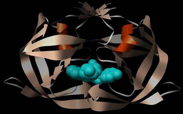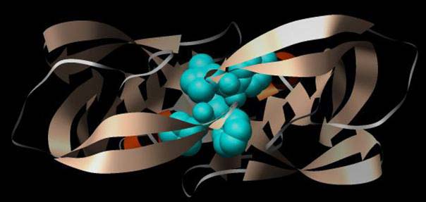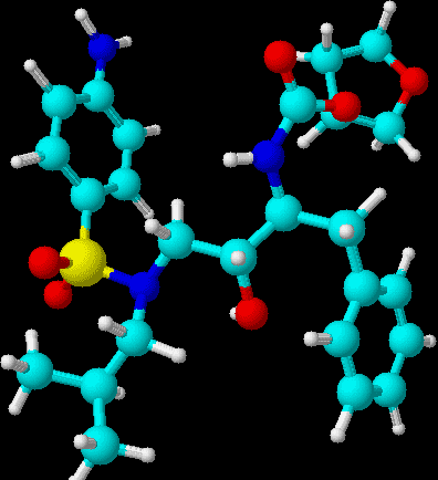 Die Abbildung zeigt, wo der Wirkstoff Amprenavir (cyan-farben) an der viralen Protease (eine Mutante) bindet, nämlich mitten im am aktiven Zentrum. Aufgrund seiner chemischen Struktur wird er für ein Peptid gehalten, doch das blockiert das Enzym, das Funktionieren ist beeinträchtigt. Die Protease besteht aus zwei komplementären Ketten, die gemeinsam ein aktives Zentrum haben, in das sich statt Substrat der Wirkstoff einlagert. Die Protease ist hier der Übersichtlichkeit wegen nur als Sekundärstruktur (Helix und Faltblatt) wiedergegeben.