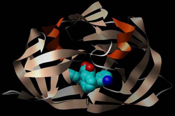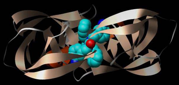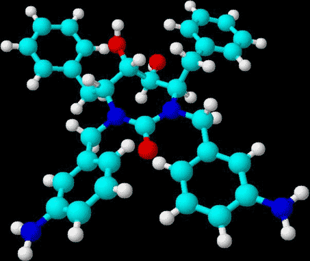 Die Abbildung zeigt, wo der Wirkstoff DMP450 (cyan-farben, Sauerstoff in rot, Stickstoff in dunkelblau) an der viralen Protease (eine Mutante) bindet, nämlich mitten im am aktiven Zentrum. Aufgrund seiner chemischen Struktur wird er für ein Peptid gehalten, doch das blockiert das Enzym, das Funktionieren ist beeinträchtigt. Die Protease besteht aus zwei komplementären Ketten, die gemeinsam ein aktives Zentrum haben, in das sich statt Substrat der Wirkstoff einlagert. Die Protease ist hier der Übersichtlichkeit wegen nur als Sekundärstruktur (Helix und Faltblatt) wiedergegeben.