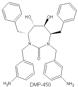 Modellsubstanz für einen Hemmer der HIV-1-Protease. Die Hemmung der Protease verhindert die Prozessierung viraler Polyprotein-Vorstufen. Es werden unreife, nicht infektiöse Virus-Partikel gebildet. Die Substanz sollte eine neue Typklasse von Proteasehemmern repräsentieren, bei der das mechanistisch wichtige Wassermolekül im aktiven Zentrum der Protease komplett durch die Carbonylgruppe verdrängt wird, wodurch eine festere Bindung und stärkere Hemmung der Protease resultieren sollte. DMP-450 sollte unter dem Namen Mozenavir in die Therapie eingeführt werden. In der Anwendung haben sich aber keine besonderen Vorteile gegenüber herkömmlichen Proteasehemmern gezeigt, weshalb das Projekt von der Firma Gilead nicht weiter verfolgt wurde. Aus diesem Grund wird die Substanz hier auch weiter unter ihrem Screening-Namen DMP-450 geführt.