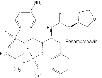 Fosamprenavir ist ein Calciumphosphat-Ester von Amprenavir und damit ein Prodrug des Protease-Hemmers Amprenavir. Synonym: GW433908. Vorteil: Bessere Verarbeitungsmöglichkeiten, weniger Tabletten zur Einnahme erforderlich. Gabe 2x tgl. Fosamprenavir ist besser löslich und wird auch besser resorbiert als Amprenavir selbst (90% absolute Bioverfügbarkeit). Dadurch kann man die Anzahl der einzunehmenden Tabletten deutlich drücken, was die Therapietreue der Patienten erhöht. Insgesamt relativ gut verträglich. Vorteil: Variable Einnahmemöglichkeiten für therapienaive Patienten: 2x 1400 mg (2x 2 Kapseln), 1x 1400 mg + 1x 200 mg Ritonavir, 2x 700 mg + 2x 100 mg Ritonavir. Eine Once-Daily-Therapie wird derzeit nicht empfohlen. Von der ungeboosterten Variante wird mittlerweile auch abgeraten. Für PI-vorbehandelte Patienten kommt jedoch nur die Variante mit 2x 700 mg und 2x 100 mg Ritonavir in Frage. Fosamprenavir kann unabhängig vom Essen eingenommen werden. Die häufigsten Nebenwirkungen betreffen den Gastrointestinaltrakt (Durchfall, Übelkeit, Erbrechen), Kopfschmerzen, Hautausschlag. Fosamprenavir verursacht bei nicht vorbehandelten Patienten keine Mutationen in der Protease, so daß weitere Therapieoptionen offen bleiben.