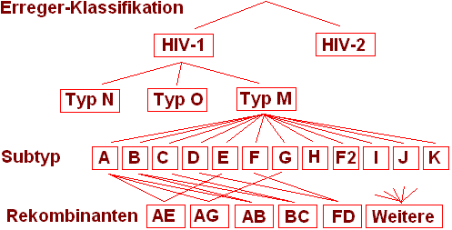 Wir haben es hier mit einem natürlichen Polymorphismus zu tun, mit einer genetischen Vielgestaltigkeit mit jeweils subtypspezifischen Unterschieden z. B. in der Protease oder anderen wichtigen Schlüsselproteinen. Die genetische Verteilung differiert, und es ist ein geographisches Verteilungsmuster erkennbar. HIV-1 ist der Virus, der hauptsächlich in den USA und Europa vorkommt, HIV-2 hat sein Revier in Afrika, breitet sich aber in letzter Zeit in Richtung Südasien (Indien) aus. Der wichtigste Typ on HIV-1 ist der Main Typ (main). Die meisten Infektionen werden durch den Typ M verursacht, Typ N und Typ O sind selten, sie kommen in Kamerun vor. Typ M ist in viele Subtypen aufgesplittet, wovon der häufigste der Subtyp C ist, gefolgt von A, dann von B, dann von D und den übrigen. Für Europa, die USA und Australien ist der Subtyp B der prädominante. Der Subtyp C dagegen dominiert in Indien, China, Pakistan. Afrika ist der Tummelplatz vieler verschiedener Subtypen. Dazu können sich die Viren rekombinieren und beispielsweise die Eigenschaften von Subtyp B und Subtyp F mischen. Eine solche Mischung ist der wichtigste Stamm in Brasilien und Argentinien. Die Rekombination BE kommt dagegen in Südostasien (Myanmar, Thailand) vor.