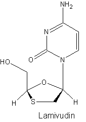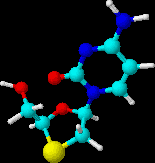 Nukleosidischer Reverse-Transkriptase-Hemmer, Nukleosid-Analogon, Cytidin-Analogon. Die Substanz wird in der Zelle zur aktiven Form des Triphosphats phosphoryliert. Dieses hemmt kompetitiv die Reverse Transkriptase und wird durch die DNA-Polymerase als falsches Substrat in die virale DNA eingebaut. Es kommt daraufhin zum Kettenabbruch der DNA (chain terminator), die Virus-Replikation wird unterbrochen. Synonym: 3TC. Gute Verträglichkeit. Resistenz entwickelt sich rasch, denn eine einzige Punktmutation genügt (M184V). Auf der anderen Seite kann diese Mutation die Empfindlichkeit von AZT-resistenten Viren erhöhen und die virale Fitneß reduzieren. Lamivudin ist eine der am häufigsten eingesetzten antiviralen Substanzen. Wirkt auch gegen Hepatitis B-Viren. Standard-Dosierung: 1x tgl. 300 mg oder 2x tgl. 150 mg. Einnahme mit Abstand zu Mahlzeiten. Nebenwirkungen: Bei Monotherapie selten, in Kombinationstherapie erheblich mehr. Typisch sind: Müdigkeit, Übelkeit, Erbrechen, Durchfall, Schlaflosigkeit, Kopfschmerzen. Die häufigste Nebenwirkung der anderen NRTIs, nämlich Neuropathien, treten hier nicht so auf.