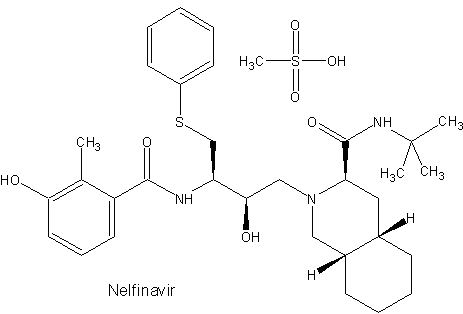 Nelfinavir ist ein Protease-Inhibitor, der reversibel und kompetitiv an das aktive Zentrum der HIV-Protease bindet. Die Hemmung der Protease verhindert die Prozessierung viraler Polyprotein-Vorstufen. Es werden unreife, nicht infektiöse Virus-Partikel gebildet. Markteinführung 1998. Nelfinavir ist relativ gut verträglich. Im Vergleich zu anderen PIs schneidet Nelfinavir aber etwas schlechter ab, und das aus mehreren Gründen: Dieser PI wird in der Regel nicht geboostert, das ist hier nicht sinnvoll, da die Blutspiegel nur geringfügig beeinflußt werden, und alleine ist der Wirkstoff schwächer als vergleichbare PIs. Die Bioverfügbarkeit ist besser als bei Saquinavir, aber die Affinität zum Enzym geringer. Die Substanz wird 3x tgl. genommen, was eine hohe Therapietreue (Compliance) erfordert. Die hohe Tablettenzahl (2x tgl. 5 oder 3x tgl. 3 zu den Mahlzeiten) macht Probleme mit der Einnahmewilligkeit und Therapietreue. Erleichterung ist zu erwarten, wenn irgendwann in Deutschland die 625mg-Kapsel (2x tgl. 2 Kapseln) eingeführt werden wird. Die Substanz kann direkt zu den Mahlzeiten eingenommen werden. Durchfälle treten sehr häufig auf (Hauptnebenwirkung, bei einem Viertel aller Patienten), weitere Nebenwirkungen sind Blähungen, Übelkeit, Lipodystrophie, Dyslipidämien, verminderte Glucosetoleranz. Nelfinavir wird nicht alleine gegeben, sondern immer in Kombination mit anderen antiretroviralen Arzneistoffen. Die bei anderen Protease-Hemmern auftretenden Mutationen des HI-Virus wurden mit Nelfinavir entweder gar nicht oder nur selten beobachtet. Zu den anderen Protease-Hemmern wie Saquinavir, Ritonavir und Indinavir konnten keine Kreuzresistenzen nachgewiesen werden.