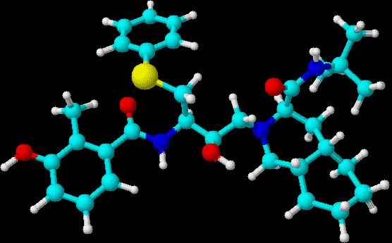 Die Abbildung zeigt, wo der Wirkstoff Nelfinavir (cyan-farben) an der viralen Protease bindet, nämlich mitten im am aktiven Zentrum. Aufgrund seiner chemischen Struktur wird er für ein Peptid gehalten, doch das blockiert das Enzym, das Funktionieren ist beeinträchtigt. Die Protease besteht aus zwei komplementären Ketten, die gemeinsam ein aktives Zentrum haben, in das sich statt Substrat der Wirkstoff einlagert. Die Protease ist hier der Übersichtlichkeit wegen nur als Sekundärstruktur (Helix und Faltblatt) wiedergegeben.