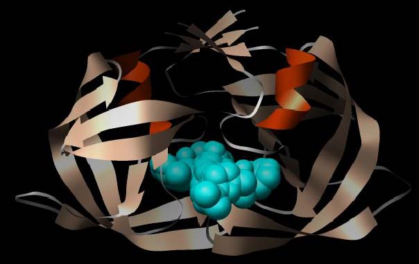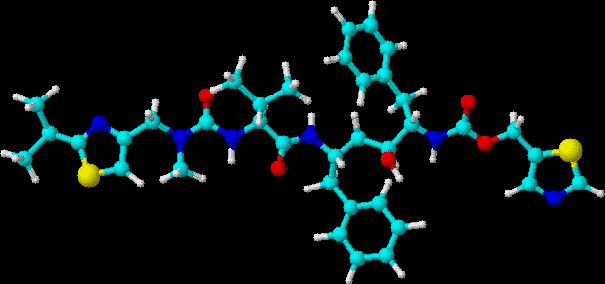 Die Abbildung zeigt, wo der Wirkstoff Ritonavir (cyan-farben) an der viralen Protease (eine Mutante) bindet, nämlich mitten im am aktiven Zentrum. Aufgrund seiner chemischen Struktur wird er für ein Peptid gehalten, doch das blockiert das Enzym, das Funktionieren ist beeinträchtigt. Die Protease besteht aus zwei komplementären Ketten, die gemeinsam ein aktives Zentrum haben, in das sich statt Substrat der Wirkstoff einlagert. Die Protease ist hier der Übersichtlichkeit wegen nur als Sekundärstruktur (Helix und Faltblatt) wiedergegeben.