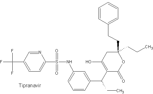 Tipranavir ist der erste nicht-peptidische Protease-Inhibitor. Tipranavir hat eine gute Wirksamkeit gegen viele PI-resistente Virenstämme. Für Salvage-Patienten stellt dieser Arzneistoff damit eine große Hoffnung dar. Tipranavir wird immer mit Ritonavir geboostert. Standarddosierung: 2x 500 mg + 2x 200 mg Ritonavir. Eine Kombination mit anderen PI wie Lopinavir, Saquinavir oder Amprenavir kommt nicht in Frage, weil Tipranavir deren Spiegel absenkt. Auch DDI sollte nur im Abstand von mehreren Stunden mit Tipranavir kombiniert werden, falls unbedingt nötig.
