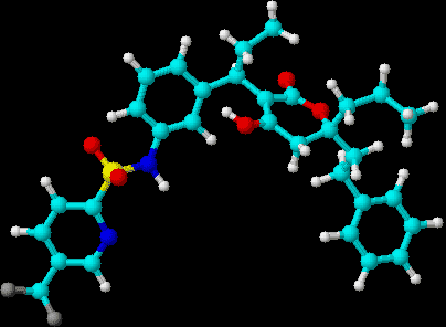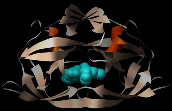 Die Abbildung zeigt, wo der Wirkstoff Tipranavir (cyan-farben) an der viralen Protease (eine Mutante) bindet, nämlich mitten im am aktiven Zentrum. Aufgrund seiner chemischen Struktur wird er für ein Peptid gehalten, doch das blockiert das Enzym, das Funktionieren ist beeinträchtigt. Die Protease besteht aus zwei komplementären Ketten, die gemeinsam ein aktives Zentrum haben, in das sich statt Substrat der Wirkstoff einlagert. Die Protease ist hier der Übersichtlichkeit wegen nur als Sekundärstruktur (Helix und Faltblatt) wiedergegeben.
