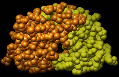 Abbildung: Dreidimensionale Struktur der Protease von HIV-1 (PDB-ID 1ODW) in sphärischer Darstellung. Das Enzym legt als Dimer vor, die beiden identischen Polypeptidketten sind in unterschiedlichen Farben dargestellt. Gemeinsam formen sie das aktive Zentrum (Hohlraum im unteren Bereich).