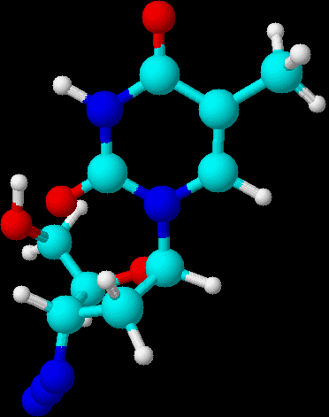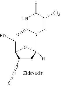 Zidovudin (Synonym: AZT) ist relativ alt, es wurde bereits 1964 synthetisiert, und es war nicht nur der erste Reverse-Transkriptase-Hemmer, sondern auch der erste therapeutisch genutzte Wirkstoff gegen HIV überhaupt (Zulassung 1986, Einführung 1987). Zidovudin ist ein nukleosidischer Reverse-Transkriptase-Hemmer vom Typ eines Antimetaboliten, es handelt sich um ein Thymidin-Analogon. Der Wirkstoff ist auch unter AZT (3Azido-3-desoxy-thymidin) bekannt. Die Substanz wird in der Zelle zur aktiven Form des Triphosphats phosphoryliert (Zidovudin-5-Triphosphat). Dieses hemmt kompetitiv die Reverse Transkriptase und wird durch die DNA-Polymerase als falsches Substrat in die virale DNA eingebaut. Es kommt daraufhin zum Kettenabbruch der DNA (chain terminator), die Virus-Replikation wird unterbrochen. Zidovudin hat eine 100 mal höhere Affinität zur Reversen Transkriptase als zur DNA-Polymerase von Säugetier-Zellen. Zidovudin ist ein wichtiger Kombinationspartner in der HAART. Ein Vorteil von Zidovudin ist die gute Liquorgängigkeit, so erreicht man auch die Virus-Reservoirs im Zentralnervensystem. Ein weiterer Vorteil von Zidovudin ist die relativ geringe mitochondriale Toxizität, was zu einer guten Langzeit-Verträglichkeit führt. Zu den häufigsten Nebenwirkungen zählen Übelkeit, Erbrechen, Völlegefühl, Kopfschmerzen, Muskelschmerzen und Schwindel. Nach einiger Zeit läßt während der Therapie die Wirksamkeit aufgrund von Resistenzentwicklung nach. Standard-Dosierung: 2x tgl. 250 300 mg