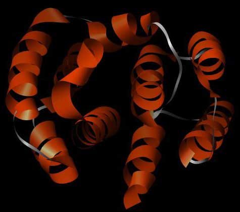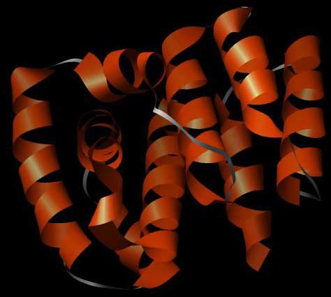 Abb.: Zwei verschiedene Ansichten des M1-Struktur-Proteins von Influenza-Viren. Dargestellt ist die Sekundärstruktur, die hier ausschließlich aus Alpha-Helices besteht. PDB-ID: 1EA3.