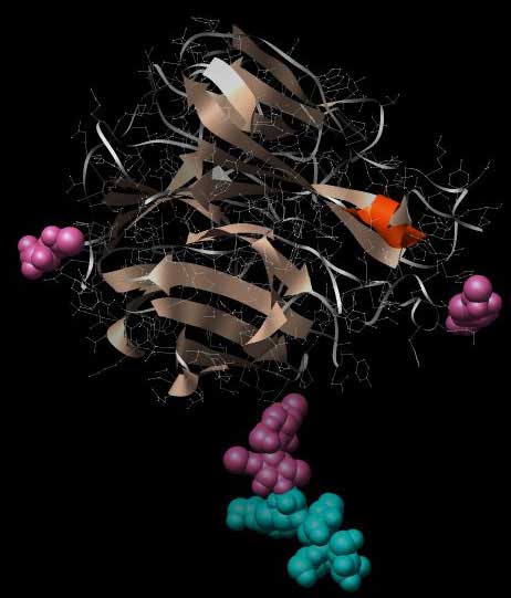 Abb.: Monomer der Neuraminidase vom Typ N9. Neben der Sekundärstruktur, die hier zum Großteil aus Beta-Faltblättern besteht, ist schwach in weiß die atomare Verknüpfung des Makromoleküls dargestellt. Als Glykoprotein ist die Proteinkette mit verschiedenen Zuckerresten verknüpft (sphärische Darstellung in violett und hellblau).