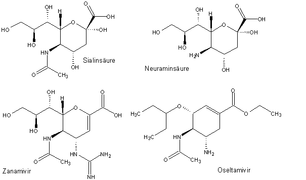 Die wichtigsten Medikamente gegen Influenza (echte Virus-Grippe) sind sog. Neuraminidase-Hemmer. Sie hemmen extrazellulär das virus-eigene Enzym Neuraminidase, welches für die erfolgreiche Freisetzung von Viren unerläßlich ist. Es gibt derzeit zwei Vertreter im Handel, nämlich Zanamivir und Oseltamivir. Davon war Zanamivir der Prototyp dieser neuen Wirkstoffklasse. Zanamivir ist in der Anwendung komplexer, weil es inhaliert wird. Dagegen ist Oseltamivir bequem als Kapsel verfügbar und derzeit ein Standardmedikament für Influenza.