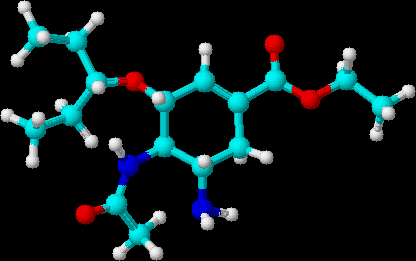 Oseltamivir (GS4104): IUPAC-Name: (3R, 4R, 5S)-Ethyl-4-acetamido-5-amino-3-(1-ethylpropoxy)cyclohex-1-en-1-carboxylat.