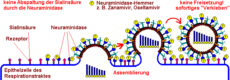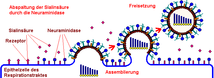 Wir erinnern uns, daß bei der anfänglichen Infektion die Kontaktaufnahme zwischen Hämagglutinin auf der Virus-Oberfläche und dem Sialinsäure-haltigen Rezeptor auf der Zelloberfläche eine entscheidende Rolle gespielt hatte. In der Tat müßte bei der Freisetzung das Gleiche passieren, und die neuen Viren würden mit der alten Zelle, die mittlerweile vor dem Exitus steht, verkleben. Die hohe Affinität des Hämagglutinins zu den Oberflächenstrukturen der Zielzellen würde hier zur Falle. Um genau dies zu verhindern, ist die Neuraminidase da: Die Neuraminidase wird vor der Knospung neuer Viren in die Membran der Zelloberfläche eingebaut. Dort trennt sie enzymatisch die Sialinsäure hydrolytisch vom betreffenden Rezeptor ab. Das geht, weil die Lipidmembran nicht statisch ist, sondern die Moleküle in ihr in ständigem Fluß sich in der Ebene bewegen können. Nach der Abspaltung der Sialinsäure ist der Weg frei, die neuen Viren können nicht mehr an die Zell-Ruine andocken, sie können sich ablösen und nach einer neuen Zelle suchen.