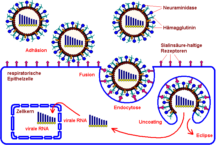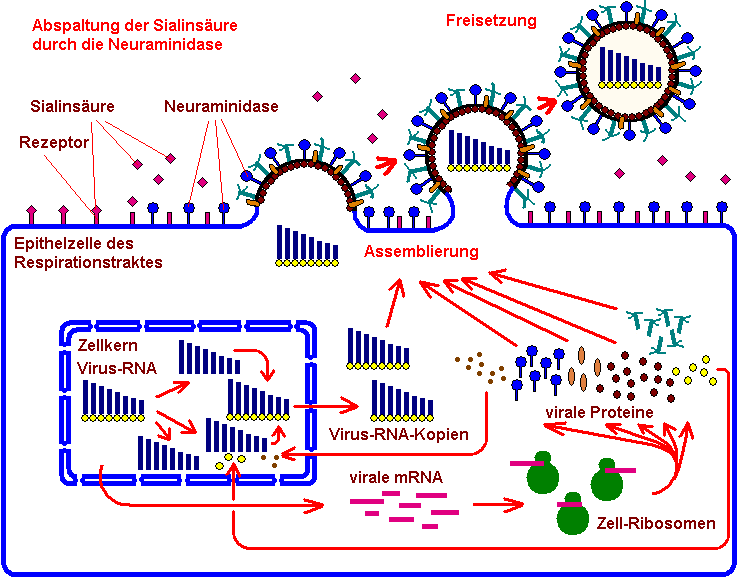 Das Freisetzen neuer Viren geschieht vorzugsweise am apikalen Ende der Epithelzellen, denn von dort aus können sich die Viren mit dem Luftstrom in den Atemwegen am besten weiter verbreiten.