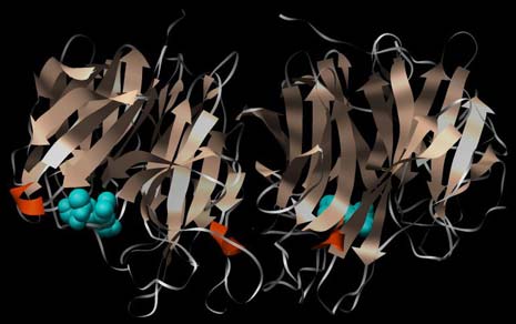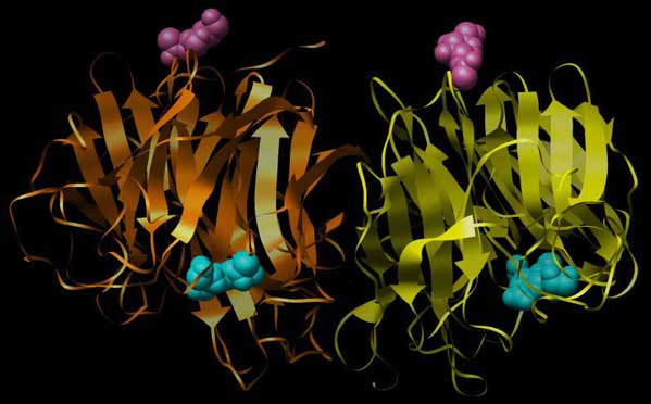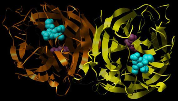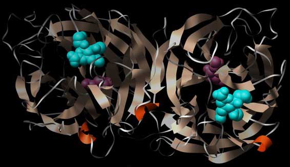 Abb.: Struktur eines Dimers von Neuraminidase. Die beiden unterschiedlichen Ketten (jeweils eine komplette Neuraminidase) sind unter Hervorhebung ihrer Sekundärstruktur hier in orange und in gelb dargestellt. In Himmelblau dargestellt ist das Molekül Zanamivir, ein Hemmstoff des Enzyms. Zanamivir ahmt den natürlichen Liganden des aktiven Zentrums nach und blockiert das Enzym. Eine wesentliche Konformationsänderung findet dabei nicht statt. Die violetten, hier ebenfalls sphärisch dargestellten Molekülteile sind die Zuckerreste des Glykopeptides. Man beachte, daß sich die Neuraminidase auf der Oberfläche der Influenza-Viren in Tetrameren zusammenfindet. PDB-ID: 1A4G.