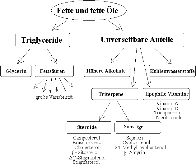 Daneben kommen in tierischen wie pflanzlichen fetten Ölen und Fetten weitere lipophile Komponenten vor, die nicht durch alkalische Hydrolyse gespalten werden können, die sog. unverseifbaren Anteile. Diese Fraktion enthält z. B. Steroide wie Cholesterol, Brassicasterol, Campesterol, b-Sitosterol, Stigmasterol, oder D7-Stigmasterol.[3,4]