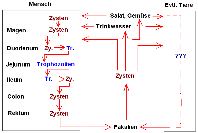 Für die Verbreitung der Infektion sind die mit dem Stuhlgang ausgeschiedenen Dauerformen (Zysten) wichtig. Nur diese können unter den widrigen äußeren Bedingungen hinreichend lange überleben, um auf die Aufnahme durch einen möglichen Wirt zu warten und diesen erfolgreich zu infizieren.