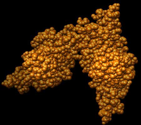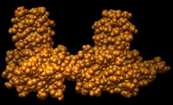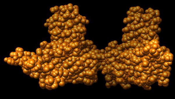 Abb.: Einzelne Protein-Einheit des Kapsides des HBV, räumliche Darstellung. Jede Einheit trägt zwei solcher Noppen bei zur "stacheligen" Oberfläche des Kapsides.