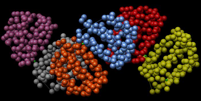 Abb.: Interferon alpha-2b, räumliche Darstellung mehrerer Moleküle (jede separate Einheit in einer anderen Farbe dargestellt). PDB: 1RH2, Radhakrishnan, R., Walter, L.J., Hruza, A., Reichert, P., Trotta, P.P., Nagabhushan, T.L., Walter, M.R. RECOMBINANT HUMAN INTERFERON-ALPHA 2B, visualisiert mit UCSF Chimera