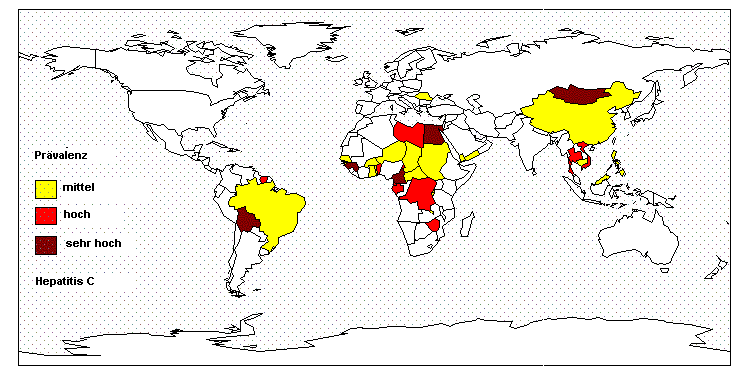 Von den Ländern der Welt her besteht ein besonders hohes Risiko für Hepatitis C in der Mongolei, in Bolivien, in Ägypten, Libyen, Kamerun,Guinea (alle > 10% Prävalenz) sowie weiteren afrikanischen (Libyen, Niger, Tschad, Sudan, Zentralafrikanische Republik, Kongo, Simbabwe, Madagaskar), südamerikanischen (Brasilien) und südostasiatischen (China, Thailand, Kambodscha) Ländern, darunter Länder mit > 5% HCV-Trägern. In Europa ist ein Endemiegebiet in Rumänien.