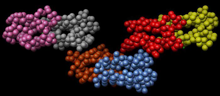 Abb.: Interferon alpha-2b, räumliche Darstellung mehrerer Moleküle (jede separate Einheit in einer anderen Farbe dargestellt). PDB: 1RH2, Radhakrishnan, R., Walter, L.J., Hruza, A., Reichert, P., Trotta, P.P., Nagabhushan, T.L., Walter, M.R. RECOMBINANT HUMAN INTERFERON-ALPHA 2B, visualisiert mit UCSF Chimera