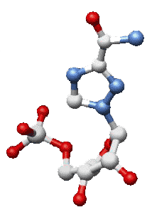 Genau wie diese Einzelbausteine besitzt Ribavirin auf beiden Seiten eine Kupplungsmöglichkeit, so daß es regulär eingebaut wird. Die Polymerase kuppelt immer neue Einzelteile an und arbeitet sich so an der Matrize entlang, und dabei wird immer wieder ein Molekül Ribavirin eingebaut. Doch wenn es ans Ablesen des neuen Stranges geht, rächt sich ein kleines Detail: Was an der Ribose dranhängt, ergibt keinen Sinn. Es handelt sich nicht um eine der vier Basen, sondern um ein Kuckucksei, entsprechend wird hier die falsche Aminosäure in das Protein eingebaut, und es entsteht Müll statt funktionierender Proteine.