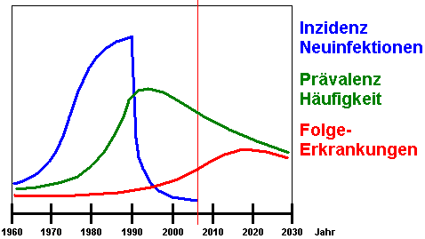 Die Infektion breitete sich aus, als dem Problem noch nicht genügend Aufmerksamkeit entgegengebracht wurde bis ca. 1990. 1989 wurde Hepatitis C erst entdeckt! Damit ist Hepatitis C eine noch relativ junge Krankheit. Ab da wurden Blutspendenkollektive in den Industrieländern kontrolliert. Die Neuinfektionen gingen seitdem rapide runter. Das eigentliche Problem, die Folgeerkrankungen, schieben wir aber wie einen Berg noch vor uns her, weil es Jahrzehnte dauert, bis sie manifest werden. Das Krankheitsgeschehen schreitet langsamer fort als z. B. bei Aids. Auch heute noch leben wir mit einer großen Dunkelziffer an HCV-Infizierten. An diesem Berg, der uns in den nächsten zwei Jahrzehnten erwartet, kann man jetzt nichts mehr ändern. Ein Maximum hinsichtlich der Mortalität wird für 2015-2020 erwartet, die Hauptwelle an Hepatitis-Kranken steht uns noch bevor.