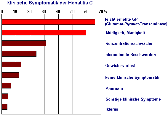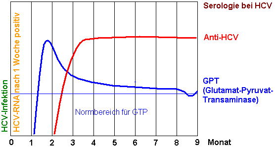 GPT: 4 Wochen nach Infektion kommt es zu einem starken Anstieg der GPT mit raschem Erreichen eines Maximums noch vor dem Ablauf des 2. Monats, worauf ein schneller Abfall erfolgt. Der Spiegel bleibt außerhalb des Normbereiches, Tendenz sinkend. Nach einem Dreivierteljahr wird der Normbereich tangiert, die Meßwerte können um die Normgrenze herum schwanken. Man kann also dann einen Patienten mit chronischer Hepatitis C auf diese Weise nicht von einem Gesunden unterscheiden.