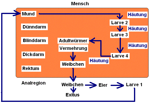 Im Darmkanal schlüpfen die Larven, die sich nach mehreren