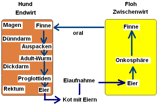 Bandwürmer folgen in der Regel einem natürlichen Räuber-Beute-Verhältnis. Dabei trägt der Räuber den erwachsenen Wurm, seine Beute die Larven. Echte Beute für den Hund sind theoretisch z. B. Schafe und Nagetiere (Verzeih mir, kleines Schoßhündchen, das nur aus der Dose frißt!). Diesem Schema folgen z. B. der Hundebandwurm oder der Fuchsbandwurm. Es gibt aber auch Bandwürmer, die sich ein Räuber-Lästling-Verhältnis für ihre Verbreitung ausgesucht haben. Ein Hund, der von Insekten, Flöhen, Milben etc. geplagt wird, schnappt oder leckt wütend nach diesen Juckreiz verursachenden Plagegeistern und bekommt ab und zu mal einen zu fassen und verschluckt ihn. Wir würden so was mit spitzen Fingern packen und unter großem "Iiiiiiiigitt!" in die Toilette werfen, der Hund schluckt es einfach - weg ist er! So wird der Plagegeist zur zwar nicht besonders nahrhaften Beute, aber immerhin: Beute ist er. Der Gurkenkernbandwurm ist ein solcher Vertreter. Endwirt ist der Hund, Zwischenwirt sind Flöhe und andere Haarlinge. Die Finnen (Wartestadien, Cysticercoiden) befinden sich im Floh.
