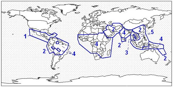 Prophylaxe mit Mefloquin oder Atovaquon/Proguanil: Wenige Gebiete in Südamerika (Brasilien: Rondonia, Roraima, Acre), gesamtes (!) Afrika südlich der Sahara, Madagaskar, Dschibuti, Mauretanien, Südafrika (Mpumalanga-Provinz, Northern Province), Papua-Neuguinea, Salomonen, Indien (nördlich der Linie Madras-Goa unter 2000 m Höhe), Bangladesh, Süd-Nepal, Indonesien (Kleine Sunda-Inseln östlich Bali, Irian Jaya, Flores, Timor), Komoren.