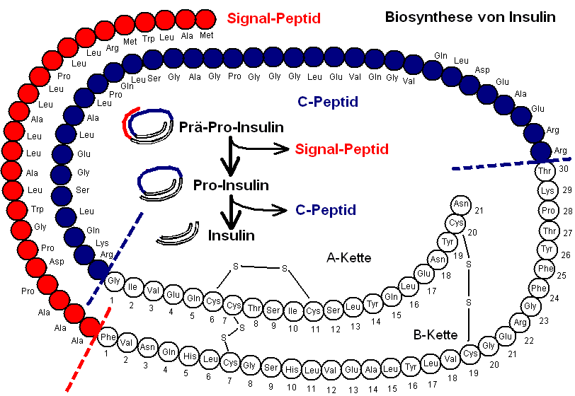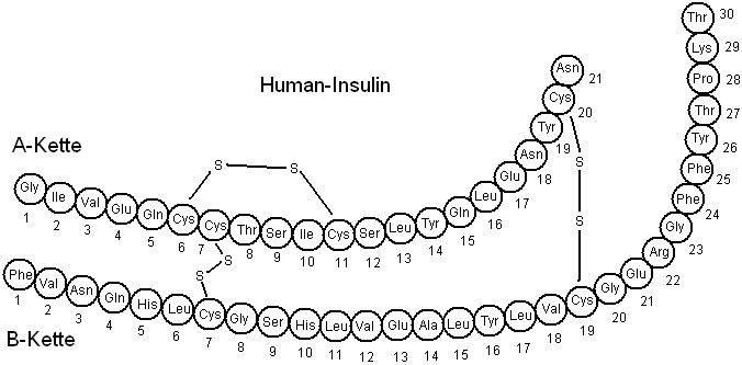 Insulin ist ein Eiweiß, das aus zwei Ketten besteht, aus einer A-Kette mit 21 und einer B-Kette mit 30 Aminosäuren. Beide Ketten sind mit zwei Disulfidbrücken verknüpft. Diese Struktur entsteht durch partiellen Abbau des von der Zelle primär synthetisierten Peptides: Zuerst wird ein Prä-Pro-Insulin synthetisiert. Ein einzelnes Gen codiert das Insulin, und gemäß diesem einen Gen wird zunächst ein einziges, wesentlich längeres Peptid gebaut. Am N-terminalen Ende befindet sich das sog. Signalpeptid, welches das Produkt als etwas markiert, das es aus der Zelle auszuschleusen gilt. Fehlte es, würde das Insulin in der Zelle liegen bleiben und nicht nach außen abgegeben werden. Aber so erkennt die Zelle, daß Insulin nach draußen befördert werden muß, und schleust es in das endoplasmatische Retikulum ein. Beim Durchtritt durch die Membran wird das Signalpeptid, das seinen Zweck jetzt erfüllt hat, abgespalten und recycelt. Das verkürzte Peptid heißt jetzt Pro-Insulin und muß erst noch durch Herausschneiden der C-Kette zum echten Insulin werden. Dies geschieht am Golgi-Apparat, danach ist das Insulin bereit zur Freisetzung durch Exocytose. Reifes Human-Insulin: