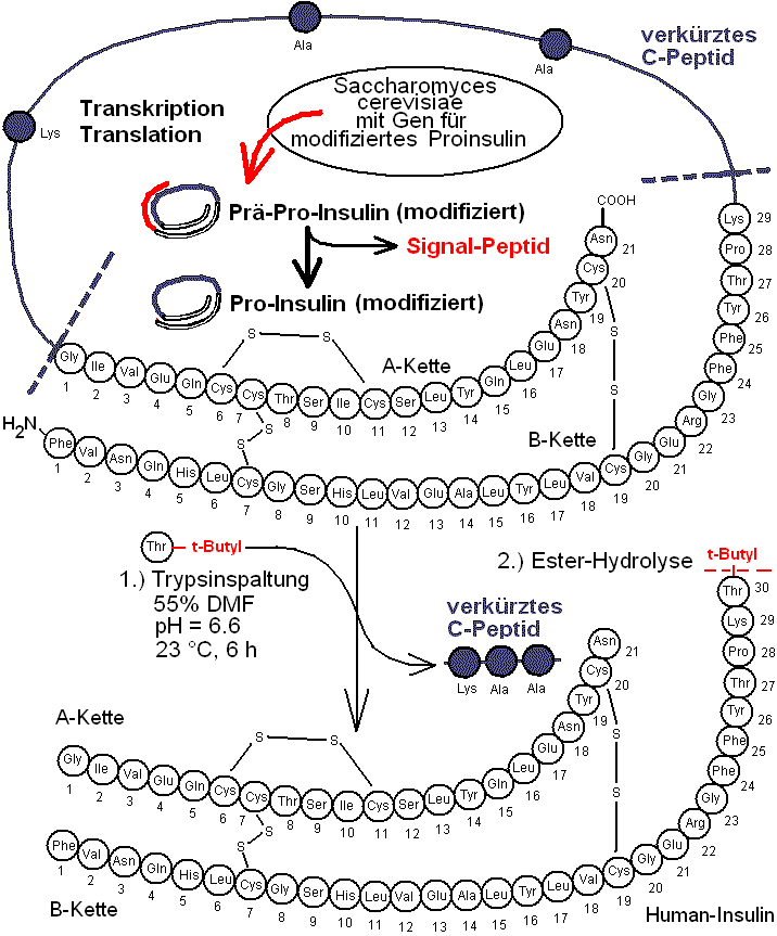 Eine weitere Möglichkeit der gentechnischen Herstellung von Humaninsulin ist die in Hefezellen, entwickelt von der Firma Novo Nordisk. Entscheidender Unterschied ist, daß das Wirtssystem jetzt keine Prokaryonten mehr sind, sondern eukaryotische Hefezellen, die Einiges mehr vermögen, z. B. können sie korrekte Disulfidbrücken liefern. Weiterhin ist die Synthese ohne endständiges Methionin möglich, sodaß insgesamt viele Aufarbeitungsschritte, wie sie bei Escherichia coli als Wirtszelle nötig sind, entfallen. Eine Besonderheit dieses Verfahrens ist die Codierung eines verkürzten C-Peptides es besteht nur aus drei Aminosäuren. Es spart Material und wirkt sich sehr günstig auf die korrekte Verknüpfung der SH-Gruppen miteinander aus. Es ist nach Isolierung des modifizierten "Bonsai-Proinsulins" nur ein winziger partialsynthetischer Schritt notwendig: Das C-Peptid wird enzymatisch herausgeschnitten, an die C-terminale Schnittstelle wird die Aminosäure Threonin gesetzt, welche mit einem tert-Butylester als Schutzgruppe versehen ist. Trypsin schneidet immer nach basischen Aminosäuren, also hier nach Lysin (B29) bzw. nach dem Lysin des C-Peptids. Dieses Schneiden ist auch der Grund dafür, daß das endständige Threonin nicht gleich zur Synthese in der Hefe mitcodiert wird. Gefährdet wäre auch Arginin (B22). Die Bedingungen werden bei diesem Verfahren exakt so eingestellt, daß nur zweimal, und zwar an den richtigen Stellen geschnitten wird. In einem nächsten Schritt wird die Schutzgruppe des Threonins (B30) abhydrolysiert, wodurch man biologisch aktives Humaninsulin erhält.