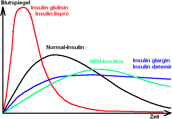 Normal-Insuline (= Altinsuline, = regular insulins): In der Regel heute rekombinante Human-Insuline ohne resorptionsverzögernde Zusätze. Insuline mit 10-30 Minuten bis zum Wirkungseintritt. Wirkungsdauer: Hält ca. 5-8 Stunden an. Im Gegensatz zu physiologischem Insulin gibt es Unterschiede: Beim Gesunden ist Insulin sofort da, wenn es gebraucht wird, und verschwindet aus dem Blut, wenn es nicht mehr nötig ist. Gespritztes Insulin hinkt zeitlich hinterher. In höherer Konzentration, wie sie beim Spritzen entstehen, neigen Insulinmoleküle zur Selbstassoziation in Form von Hexameren. Diese Hexamere müssen nach der Anwendung zuerst in Dimere und dann in Monomere zerfallen, denn es wirkt nur das freie Insulin-Monomer. Im Gegensatz zu physiologischem Insulin ist der geschwindigkeitsbestimmende Schritt beim gespritzten Insulin die Freisetzung von Monomeren. Deshalb werden beim Spritzen erst später höhere Konzentrationen als beim gesunden Menschen erreicht, deshalb muß ein Spritz-Eß-Abstand eingehalten werden, deshalb ist sowohl die Blutzuckerspitze nach dem Essen als auch die nach dem Verdauen noch anhaltende Wirkung des Insulins mit dem Risiko der Unterzuckerung zwischen den Mahlzeiten ein Problem.