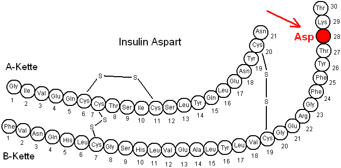 Veränderungen: Ist ein Insulinanalogon, bei dem im Vergleich zu Normalinsulin eine Aminosäure ausgetauscht wurde: In der B-Kette hat in Position 28 eine Asparaginsäure das vorher dort befindliche Prolin ersetzt, daher der Name "Aspart".