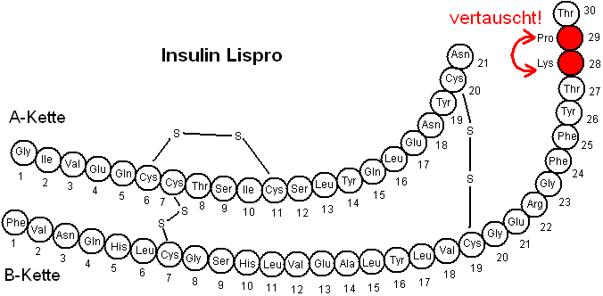Veränderungen: Ist ein Insulinanalogon, bei dem im Vergleich zu Normalinsulin zwei Aminosäuren vertauscht wurden: In der B-Kette sind die Positionen 28 und 29 vertauscht, Lysin und Prolin wechseln den Platz, daher auch der Name "Lys-Pro" = "lispro".