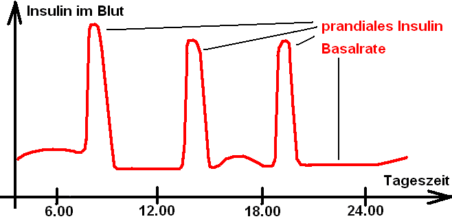 Zum einen ist die Insulin-Ausschüttung natürlich von den Mahlzeiten abhängig. Zum andern wird die Ausschüttung des basalen Insulins von Hormonen in einen circadianen Rhythmus gesteuert. Wachstumshormon und Cortisol hemmen die Insulinempfindlichkeit, dadurch steigt der Insulinbedarf. Folglich wird vermehrt Insulin ausgeschüttet, wenn verstärkt Cortison ausgeschüttet wird, also am frühen Morgen zwischen 5 und 8 Uhr und schwächer ausgeprägt am späten Nachmittag. Dieser ganz natürliche Mehrbedarf am frühen Morgen kann bis zu 10% der Tagesmenge Insulin ausmachen. Genauso wirkt sich dieser Effekt auf die Höhe des zum Essen ausgeschütteten Insulinpeaks aus für das Frühstück ist er höher als für das Mittagessen.