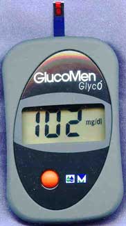 GlucoMen PC: Gerätevariante, speichert 350 Meßwerte mit Datum und Uhrzeit, Blättern mit Pfeiltasten möglich. Ansonsten ähnlich.