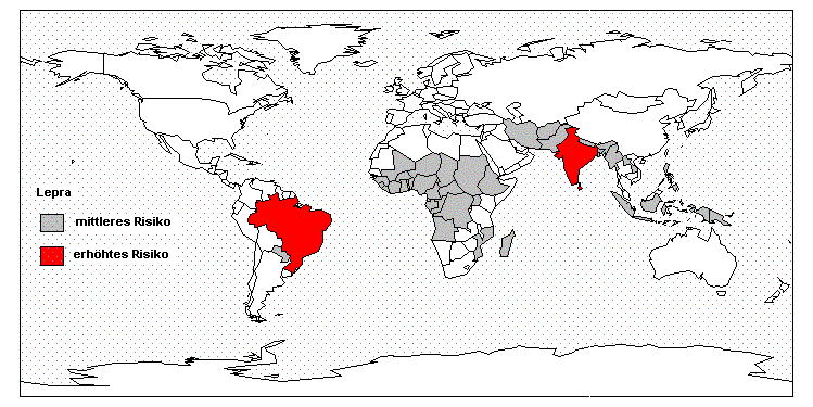 Die Länder mit den meisten Leprakranken sind Indien (an erster Stelle), Brasilien, Bangladesh, Myanmar (Burma), Nigeria, aber die meisten ärmeren Entwicklungsländer wie z. B. Indonesien oder Nepal sind ebenfalls betroffen. Früher kamen die Bakterien fast auf der ganzen Welt vor. Aus hauptsächlich sozioökonomischen Gründen ist die Krankheit im 16. Jahrhundert in Europa bis auf ein paar isolierte Orte fast ausgestorben.