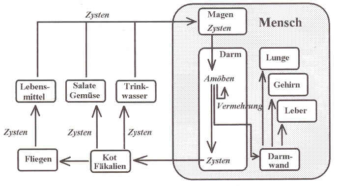 Amöben bilden sog. Zysten. Das sind Amöben, die sich in einer schützenden Hülle verpackt haben und an der Außenwelt widrige Bedingungen überleben können. Zysten sind überall dort, wo Fäkalien von Erkrankten hingelangen. Wer diese Zysten aufnimmt, kann infiziert werden: Im Dünn- oder Dickdarm verlassen die Amöben ihre schützende Hülle und beginnen mit der Vermehrung. Der Mensch erkrankt also an Amöbenruhr durch mit Fäkalien verseuchtes Trinkwasser, durch fäkal verunreinigte Lebensmittel (Gemüse, Salate). Oder es werden einwandfreie Speisen nachträglich verunreinigt, z. B. durch Fliegen. Gerade Fliegen dürfen als Überträger nicht unterschätzt werden, weil sie genauso gerne Fäkalien wie Lebensmittel aufsuchen.