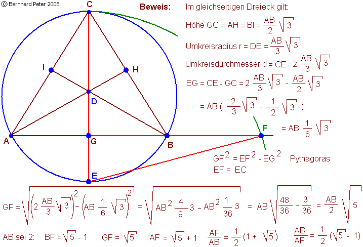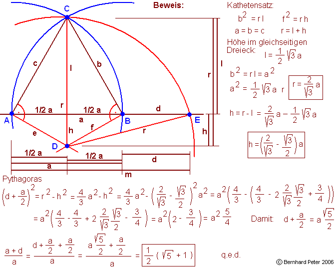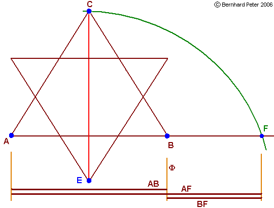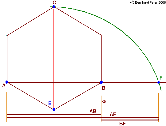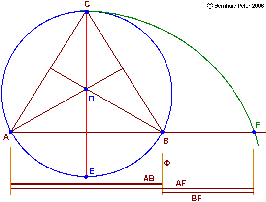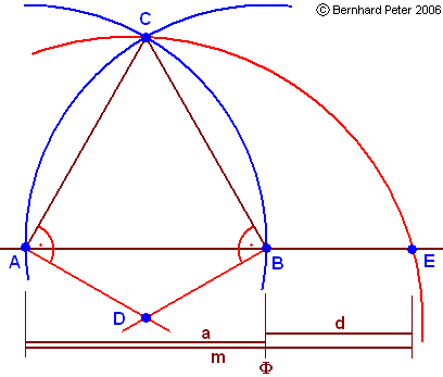 Gegeben sei die Strecke AB. Über der Strecke wird ein gleichseitiges Dreieck errichtet durch Schlagen von Kreisen um A und um B mit dem Radius AB. Der Schnittpunkt beider Kreise sei C. Auf den Verbindungsgeraden AC und BC werden die Senkrechten errichtet, deren Schnittpunkt D sei. Um D wird ein Kreis mit dem Radius DC geschlagen. Dessen Schnittpunkt mit der Verlängerung von AB sei E. Der Punkt E markiert die äußere Teilung der Strecke AB. Die Strecken BE, AB und AE verhalten sich zueinander wie der Goldene Schnitt.