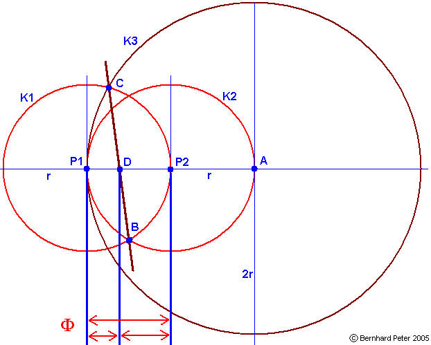 Ende des Kreises K2. Um A wird ein Kreis K3 mit dem Radius 2r
