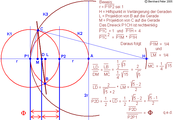 Eine Strecke AB habe zwei Endpunkte, A und B, sowie einen Mittelpunkt C. Um jeden dieser drei Punkte wird ein Kreis mit dem Radius AB geschlagen. Die Kreise bilden oberhalb und unterhalb der zu teilenden Strecke jeweils drei Überschneidungspunkte. Die Verbindungslinie zwischen einem mittigen Kreuzungspunkt zu einem gegenüberliegenden äußeren Überschneidungspunkt teilt die ursprüngliche Strecke im Sinne des Goldenen Schnittes (Innere Teilung) in Punkt F. Es handelt sich bei gegebener Strecke AB um eine Fünf-Schritt-Konstruktion: 2 Kreise, Mittelteilung, dritter Kreis, Verbindungslinie.