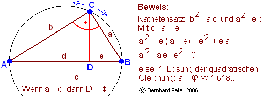 Konstruktion 22: Wenn in einem beliebigen rechtwinkligen Dreieck der Punkt C so gewählt wird, daß die kleinere Kathete a genauso lang ist wie der längere Hypotenusenabschnitt d, der durch das Lot von C auf die Hypotenuse erzeugt wird, so teilt das Lot die Hypotenuse im Goldenen Schnitt.