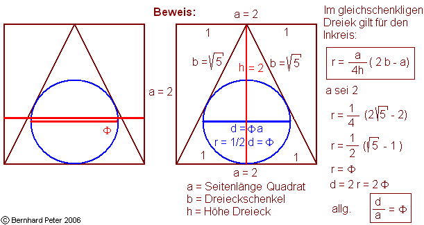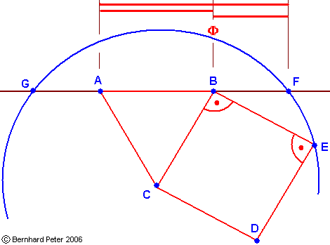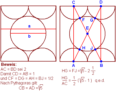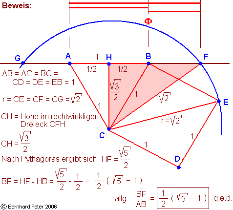 Beweis: Die Strecke CF ist der Kreisradius, welcher sich aus der Diagonale CE des Quadrates ergibt. Kreisradius (Hypotenuse) und Höhe des gleichseitigen Dreiecks CH (kürzere Kathete) spannen ein rechtwinkliges Dreieck CHF auf, dessen längere Kathete HF abzüglich der halben Strecke AB die Verlängerungseinheit BF liefert, welche zu AB im Verhältnis des Goldenen Schnittes steht.