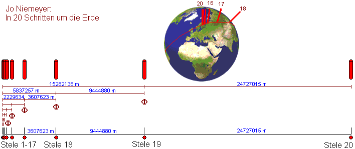 Hier die Position der einzelnen Stelen (Quelle: Jo Niemeyer, Dr. Ulrich Grevsmühl: In 20 Schritten um die Erde, Dokumentation):